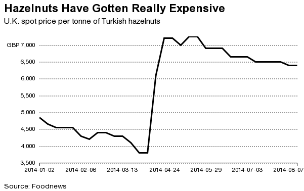 little jars of chocolate but poor weather in Turkey has sent hazelnut prices
